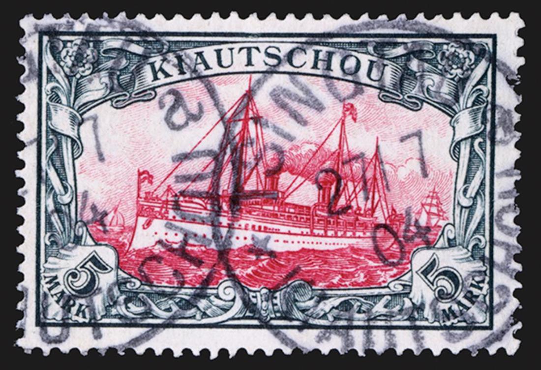 #21-22, 1901 3M Black violet and 5M Slate and carmine, both used with two strikes of Kiauchau datestamps, the 3M tied to small piece, very fine; 3M signed Bothe.