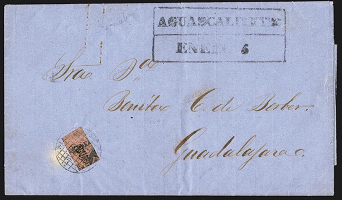 #11b, 1861 8r Black on red brown, quadrisect, the bottom right corner tied by grid to 1863 folded letter to Guadalajara, large boxed "Aguascalientes/Enero 5" handstamp, very fine; signed Bash.