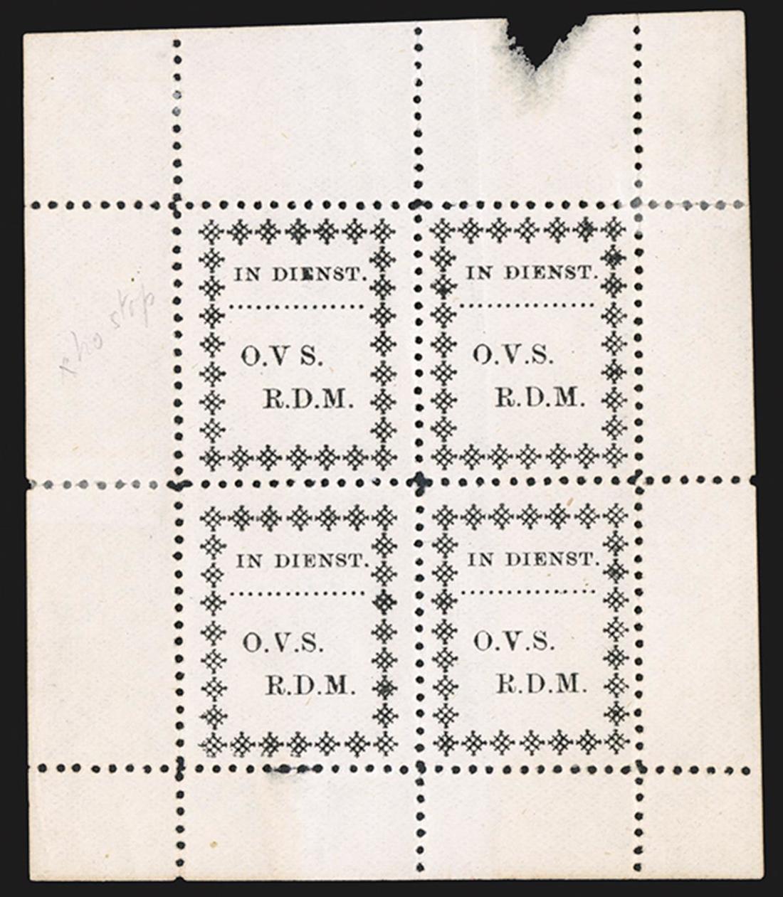 S.G. #PF2, 1898 (-) Black, second issue, an exceedingly rare full sheet of four, pos. 1 showing no stop after "V", pos. 2 showing broken base to "O", pos. 3 with broken left serif to "V", and pos. 4 showing no special features, full clean o.g. with a hint of toning, piece of selvage missing above pos. 2 which also has a light crease, and small thin in selvage below pos. 3, otherwise very fine; an essential multiple for plating this issue.