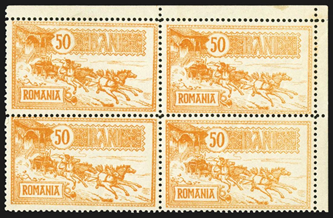 #158-65, 1903 1b-50b Opening of Bucharest post office cplt., fresh mint blocks of four, o.g., occasional small gum blemish or fault on one, but will yield three never hinged set, fine-very fine.