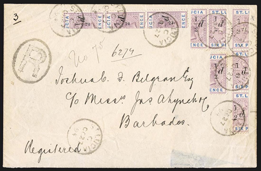 #41, 1892 "½d" Surcharge on half of 6d Lilac and blue, registered cover to Barbados franked by two vertical strips of three, a horizontal pair and a single, including the variety thick "1" with sloping serif (#41a), all tied by seven strikes of "St. Lucia/Oc 27, 94" datestamps, large "R" in oval handstamp and "Barbados/No 3, 94" arrival backstamp, four stamps affected by creases, otherwise very fine and striking (S.G. #54, 54e).