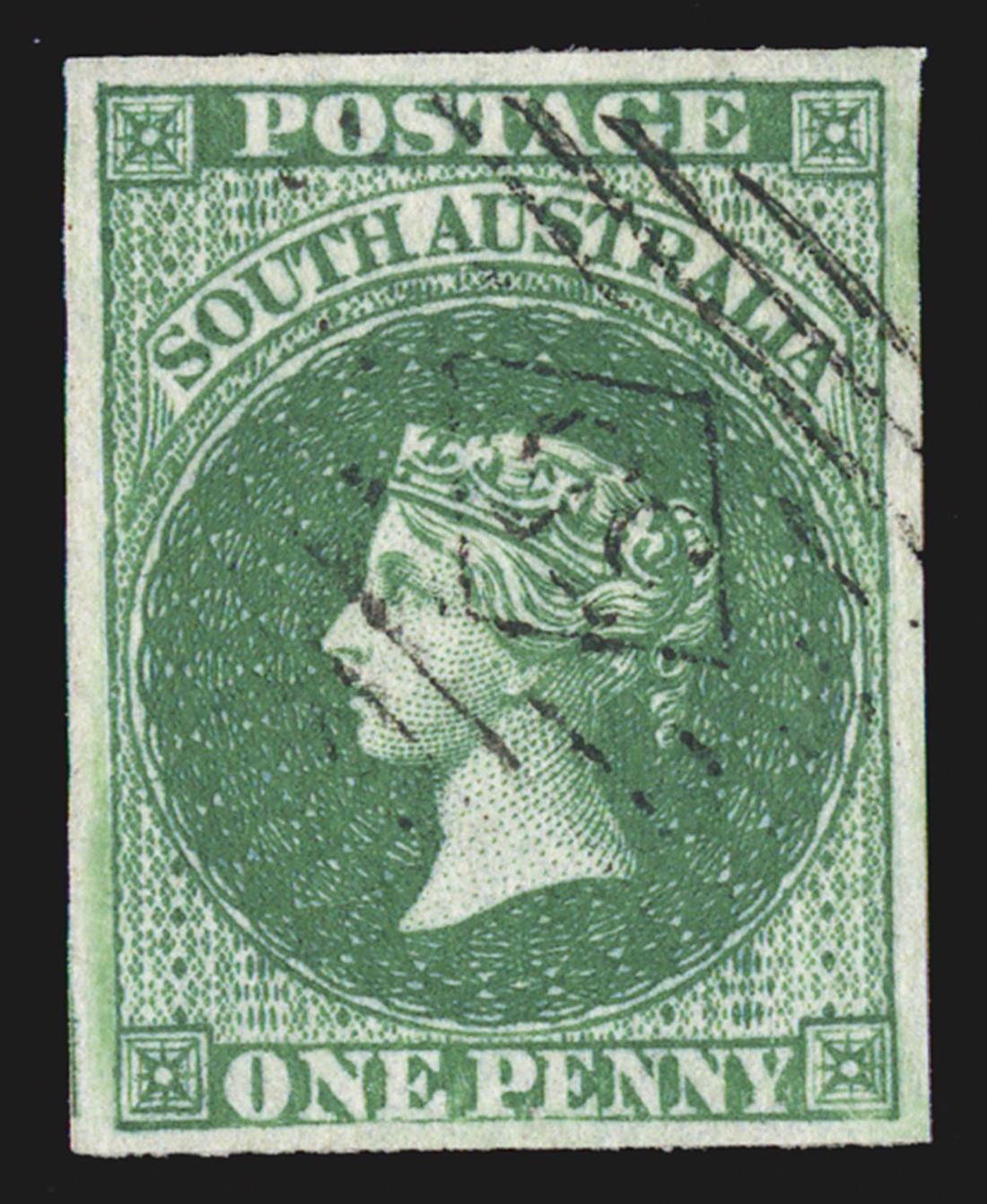 #1, 1855 1d Dark green, a superb used example for this classic first issue, boasting uncommonly large even margins all around, intense color and crisp impression on fresh white paper, neatly cancelled by "55" in grid of Strathalbyn, an extremely fine gem with few peers; 1997 BPA certificate (S.G. #1; £500).