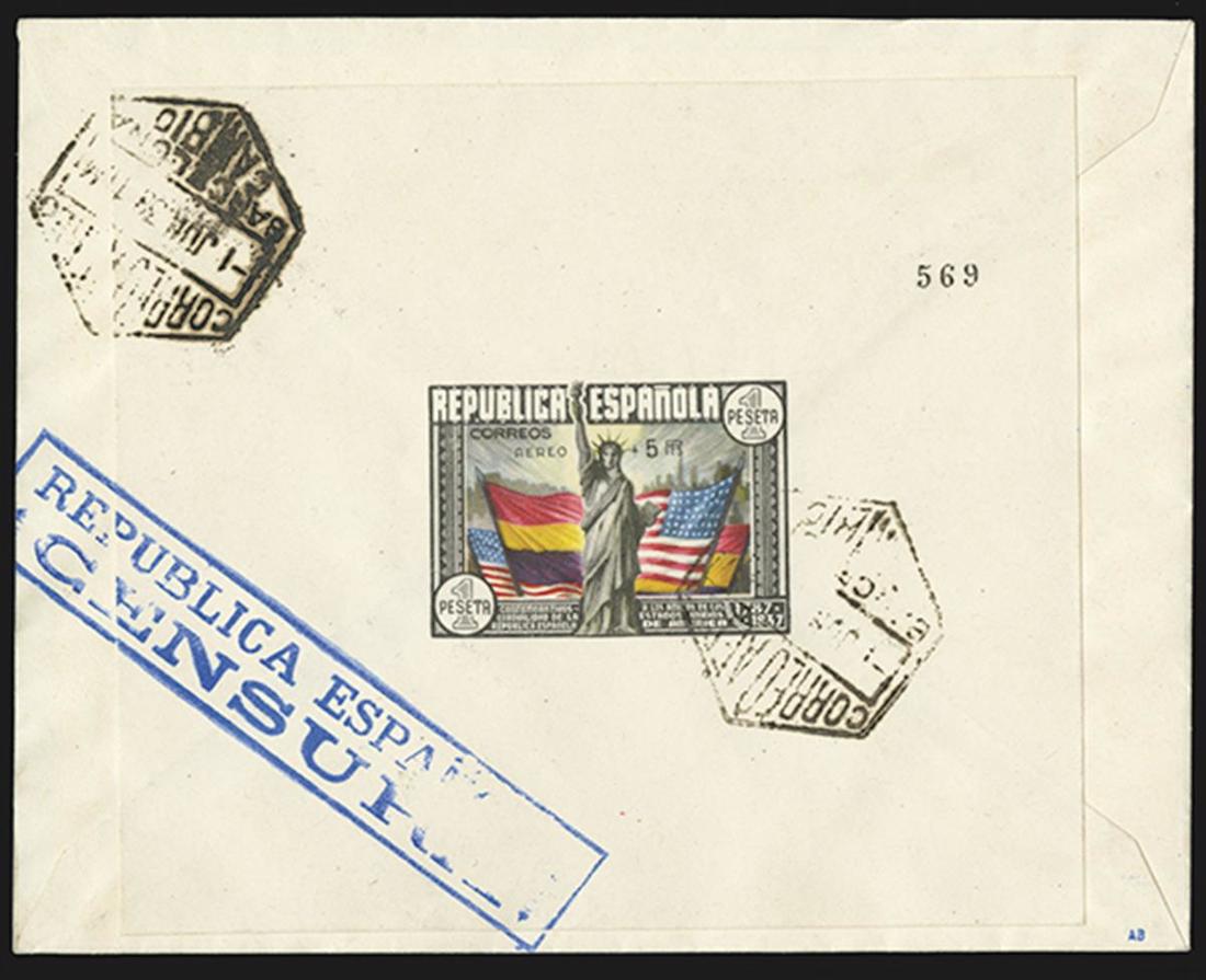 #C97c, 1938 "Aereo +5Pts" surcharge on 1P United States Constitution air post souvenir sheet of one, tied by hexagonal "Correos Aereo/Barcelona/Cambio/1 Jun 38" first day of issue postmark to the reverse of a cover addressed locally with "Emitado Hoy***First Day if Issue" imprint, blue boxed censor's handstamp on front and on back tying the souvenir sheet, very fine and choice; a rare first day cover with only 25 produced; signed Kessler.