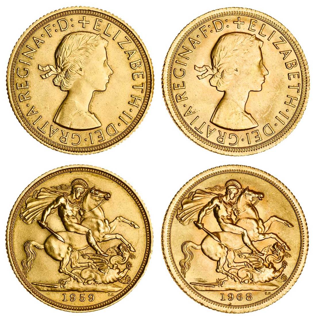 Elizabeth II (1952-), Sovereign (2), 1959, 1968, young laureate head right, rev. St George and dragon (S.4125), uncirculated (2)