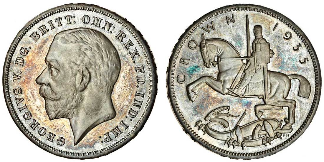 George V (1910-1936), proof Jubilee Crown, 1935, head left, rev. St George, raised error edge decus anno regni et tutamen xxv (ESC 380; S.4050), almost as struck and lightly toned, very rare, in box of issue