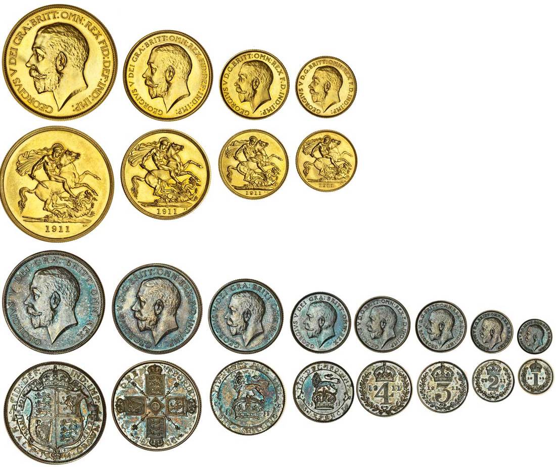 George V (1810-36), proof set, 1911, 5-Pounds, 2-Pounds, Sovereign, Half-Sovereign, Halfcrown, Florin, Shilling, Sixpence, Fourpence, Threepence, Twopence, Penny, bare head left, rev. (S.PS11), brilliant mint state, in case of issue (12)