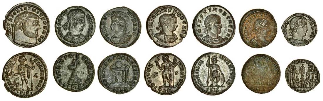 Licinius I (308-324), Follis, Siscia, 315-316, laureate head right, rev. iovi conservatori, Jupiter standing left, holding Victory on globe and sceptre, eagle at feet (RIC 17), extremely fine, Licinius II, Caesar, Follis, Arelate, 317, laureate, draped and cuirassed bust right, rev. as last, but Jupiter holds thunderbolt, no eagle (RIC 125), good very fine, Crispus, Caesar, Follis, Siscia, 317, bust as last, rev. principia ivventvtis, Crispus standing right, holding reversed spear, and leaning on shield at his side (RIC 39), residual silvering, almost extremely fine, another, London, 323-324, helmeted, cuirassed bust left, rev. beat tra *** qlitas, altar inscribed vot/is/xx, plon in exergue (RIC 275), good very fine, Delmatius, as Caesar, reduced Follis, Antioch, 335-337, laureate, cuirassed bust right, rev. gloria exercitvs, two soldiers standing either side of standard (RIC 112), about extremely fine, Constantine II, as Caesar, Follis, Nicomedia, similar bust, rev. camp gate, fine, and Constans (337-350), AE Nummus, Siscia, 348-350, pearl-diademed, draped and cuirassed bust right, rev. fel temp reparatio, phoenix on mound, wreath in beak (RIC 234), very fine (7)