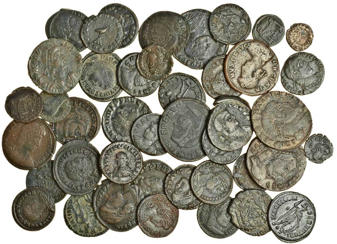Fourth century bronze Folles, comprising Maxentius (3), one with his bust left, wearing imperial robe and holding eagle-tipped sceptre, Licinius I (3), Licinius II, Constantine I (11), a commemorative AE 4, Constantinople, laureate head of the Roman People left, cornucopia over shoulder, pop. romanvs, rev. bridge with tower at each end, river below, cons/s between towers (RIC 21), and Urbs Roma (3), and a miscellany of emperors through the century, ending with Magnus Maximus, fine to very fine (42)