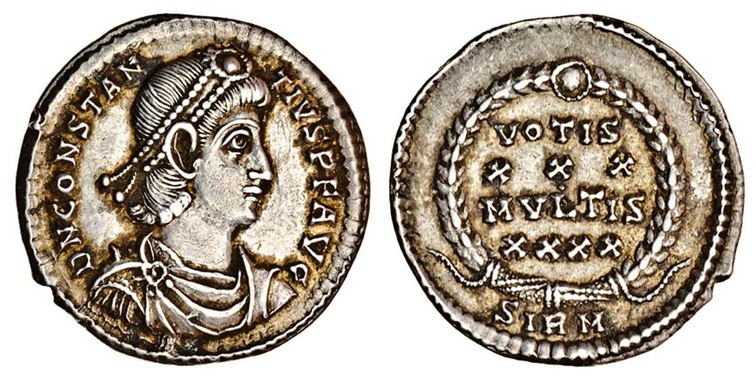 Constantius II (337-361), AR Siliqua, Sirmium, 351-355, pearl-diademed, draped and cuirassed bust right, rev. votis / xxx / mvltis / xxxx within wreath, sirm in exergue (RIC 15; RSC 342-3e), about extremely fine