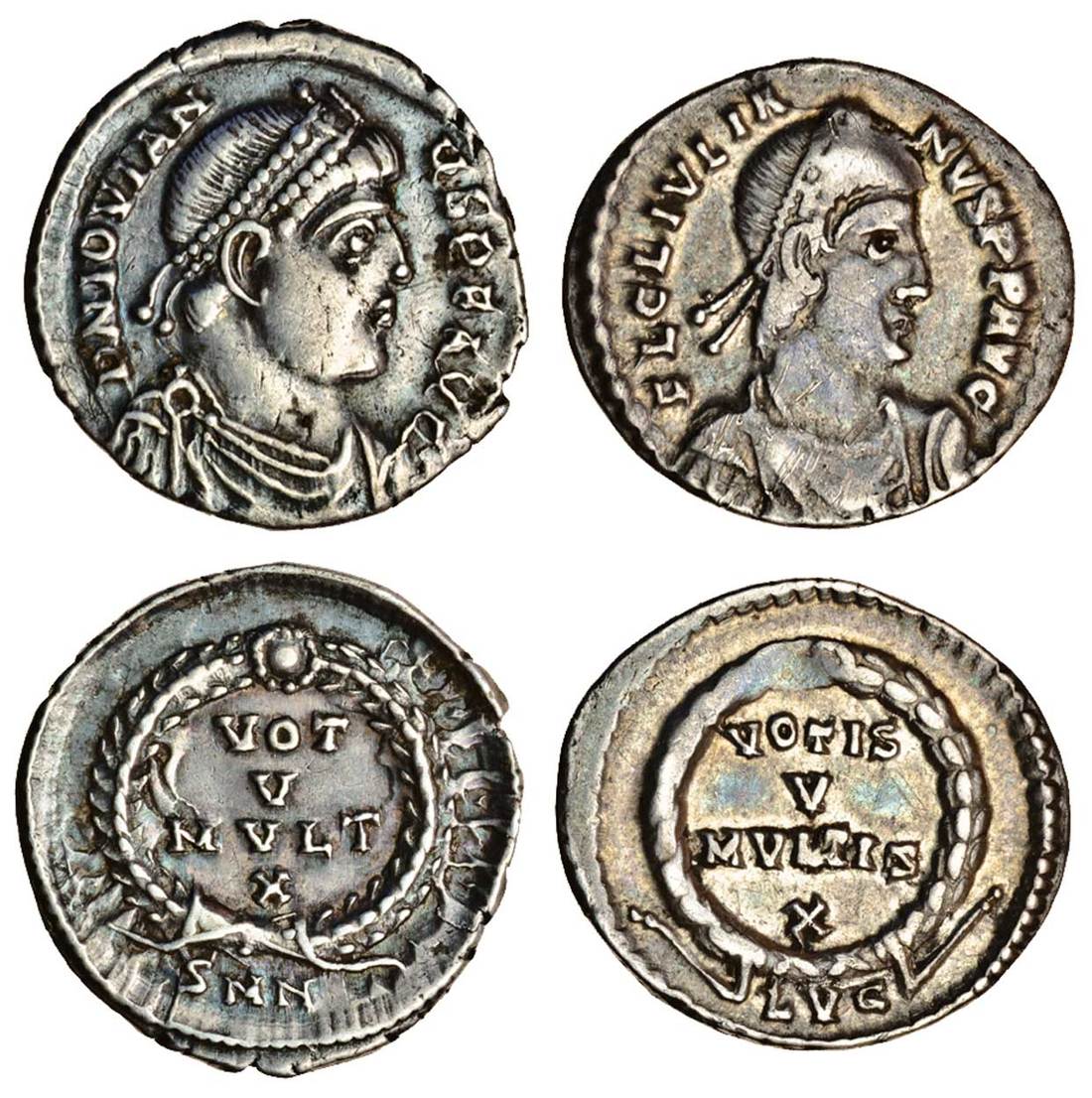 Julian II (360-363), AR Siliqua, Lugdunum, pearl-diademed, draped and cuirassed bust right, rev. votis / v / mvltis / x, within wreath, lvg in exergue (RIC 218; RSC 163†a), good fine, and Jovian (363-364), AR Siliqua, Nicomedia, bust as last, rev. vot / v / mvlt / x within wreath, smn in exergue (RIC 127; RSC 33Ae), very fine (2)