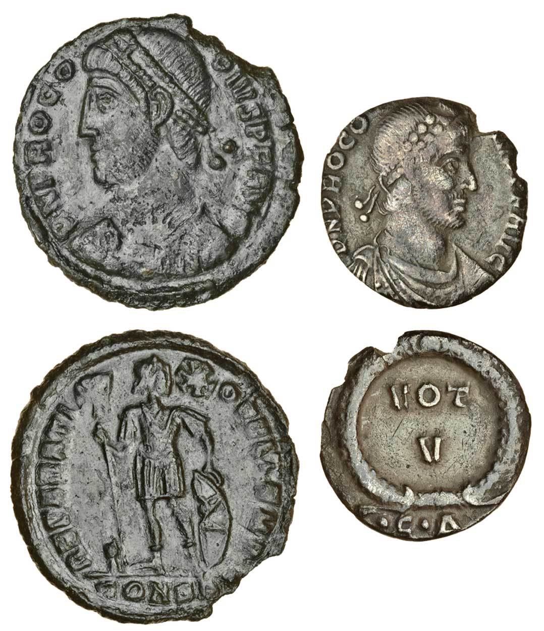 Procopius (365-366), AR Siliqua, Constantinople, pearl-diademed, draped and cuirassed bust right, rev. vot / v within wreath, ·c· in exergue (RIC 13e; RSC 14†d), significantly clipped, toned, rare, good fine, together with an AE 3, same mint, similar bust left, rev. reparatio fel temp, emperor standing facing, head right, holding labarum, his left hand on shield at side, Christogram above, uncertain object by shaft of labarum, consb in exergue (RIC 17a), green patina, very fine (2)