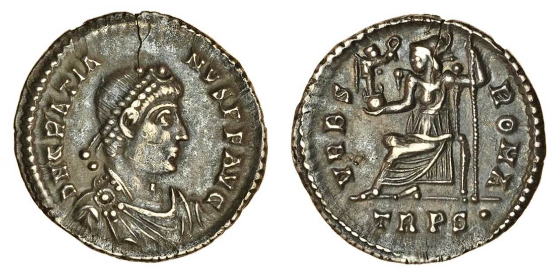 Gratian (367-383), AR Siliqua, Trier, pearl-diademed, draped and cuirassed bust right, rev. vrbs roma, Roma seated left, holding Victory on globe, and spear, trps· in exergue (RIC 27f; RSC 86†a), minor flan-crack, good very fine
