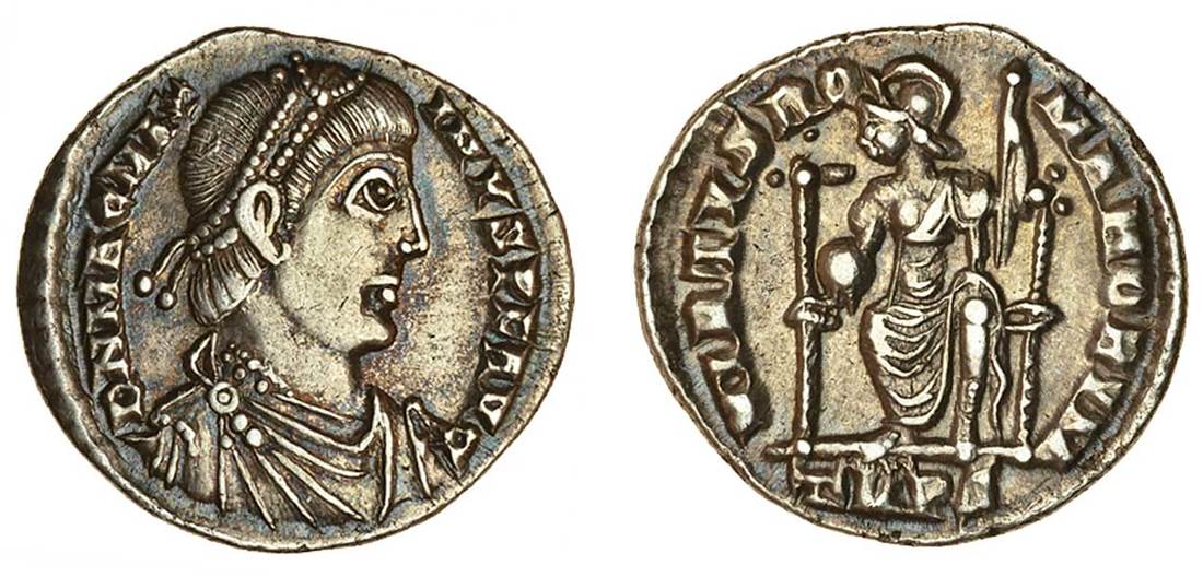 Magnus Maximus (383-388), AR Siliqua, Trier, pearl-diademed, draped and cuirassed bust right, rev. virtvs romanorvm, Roma seated facing, head left, holding globe and spear, trps in exergue (RIC 84b; RSC 20†a), toned, good very fine