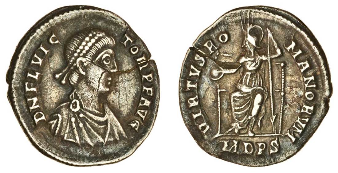 Flavius Victor (387-388), AR Siliqua, Milan, pearl-diademed, draped and cuirassed bust right, rev. virtvs romanorvm, Roma seated facing, head left, holding globe and spear, mdps in exergue (RIC 19b; RSC 6Ac), toned, flan-crack, very fine