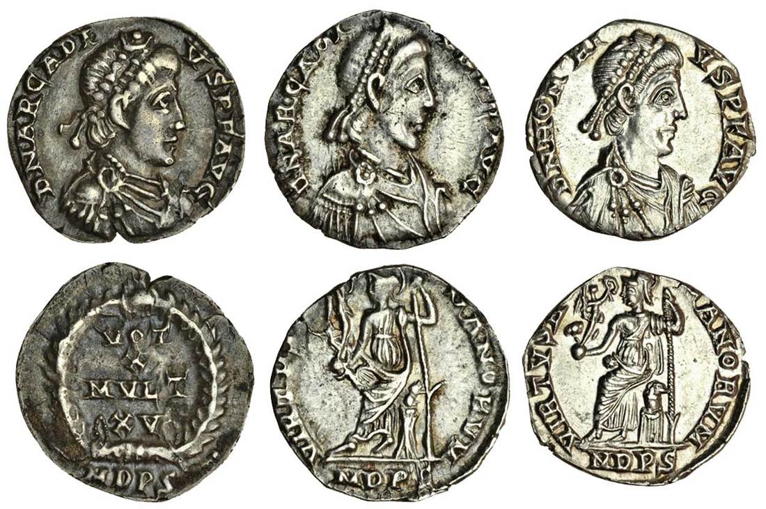 Arcadius (383-408), AR Siliqua, Milan, pearl-diademed, draped and cuirassed bust right, rev. vot / x / mvlt / xv within wreath, mdps in exergue (RIC 13; RSC 27B), toned, good very fine, another, similar but rev. virtvs romanorvm, Roma seated left on cuirass, holding Victory on globe and spear (RIC 32b; RSC 27b), very fine, together with Honorius (393-423), AR Siliqua, Milan, similar types, mdps in exergue (RIC 32c; RSC 59†b), clipped, extremely fine (3)