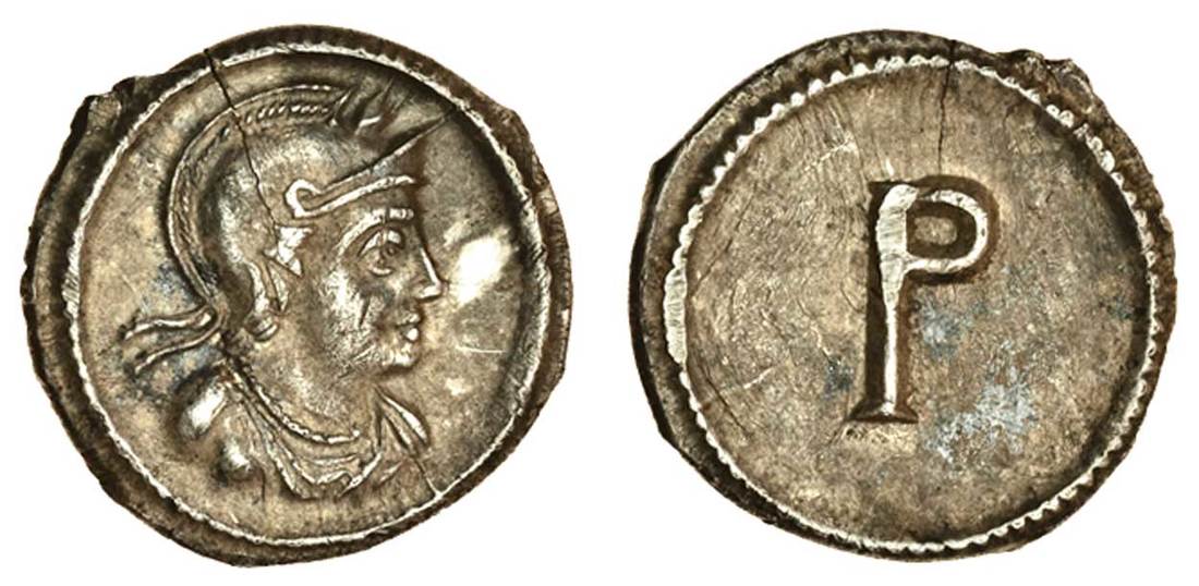 Period of Constantine (5th -6th cents AD), AR Half Siliqua, 1.07g, Constantinople, helmeted and draped bust of Roma right, rev. large P (Bendall, Rev. Num. 158 (2002), p.140, type 2), narrow flan-crack and light graze before bust, good very fine and rare