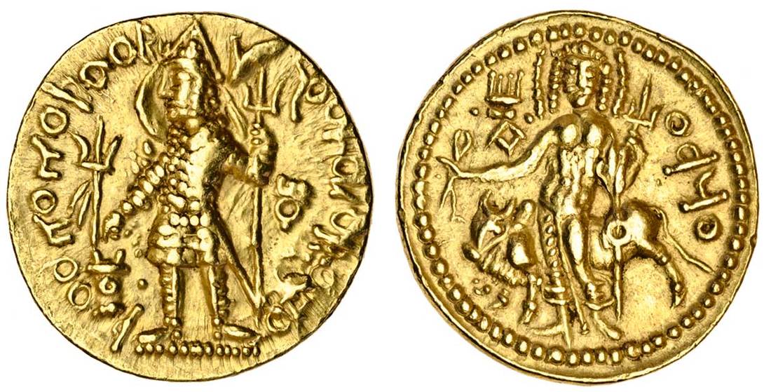 Kushan Empire, Vasu Deva II (c.267-98), AV Dinar, 8.04g, king standing left making offerings at a fire altar, holding a standard right, trident in left field, rev. three-headed Siva standing before Nandi left, holding a trident and noose (Göbl 644), extremely fine