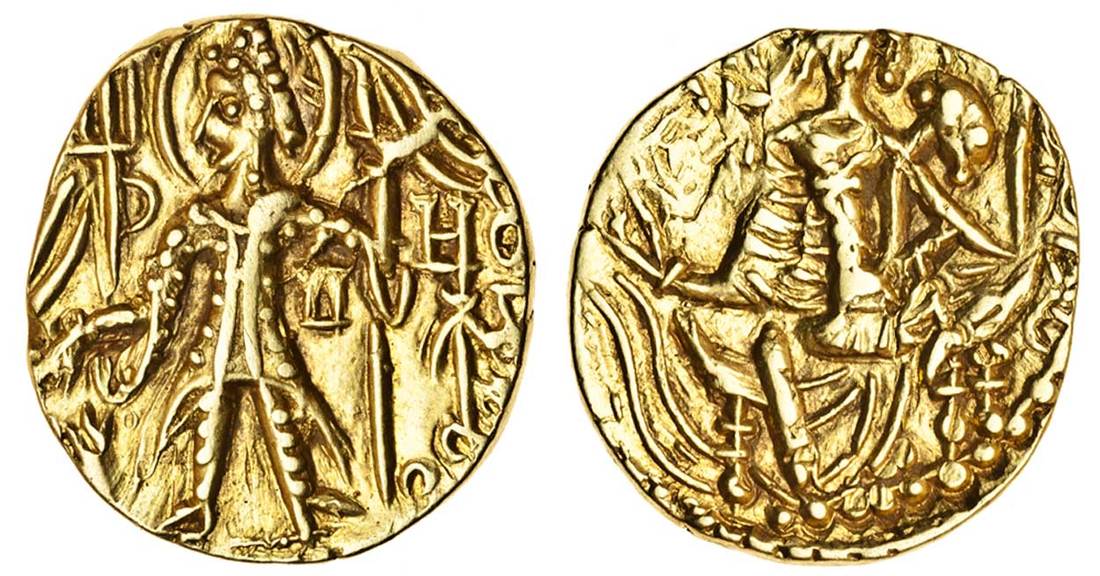 Late Kushan, Shaka (early 4th century), AV Dinar, 7.77g, king standing left, shaka in right field, Brahmi letter pa below arm, rev. Ardoksho seated on throne (Göbl 581; MAC.3370-80), edge split near Ardoksho's head, good very fine