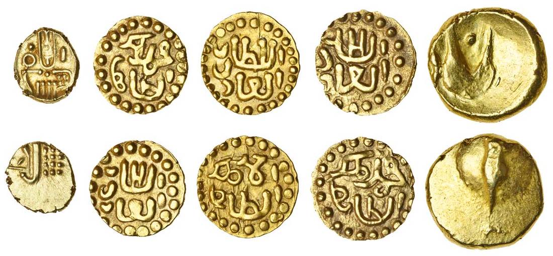 India, Sultans of Bijapur (1141-58), AV Pagoda (MNI.1292), very fine; South India, AV Fanam, extremely fine; Indonesia, Sultans of Samudra-Pasai, AV Kupangs (3) Muhammad (1297-1326) (2), Ahmad II (1326-46) (Mitch.SEA, 742, 744; Leyten SP 4a, 5), good very fine to extremely fine (5)