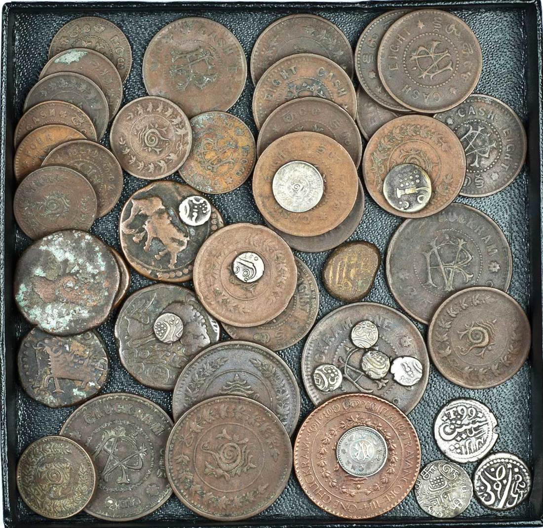 South India, Cochin, 2-Puttun, Chuckrams (3), Tellicherry, 1/5-Rupee (2), T99, Travancore, Velli Fanam, 2-Chuckrams (2), Chuckrams (4), AE Chuckrams (6), 8-Cash (15), 4-Cash (10), Mysore, AE Coins (5), Ramnad, AE Cash, fine to very fine (50)