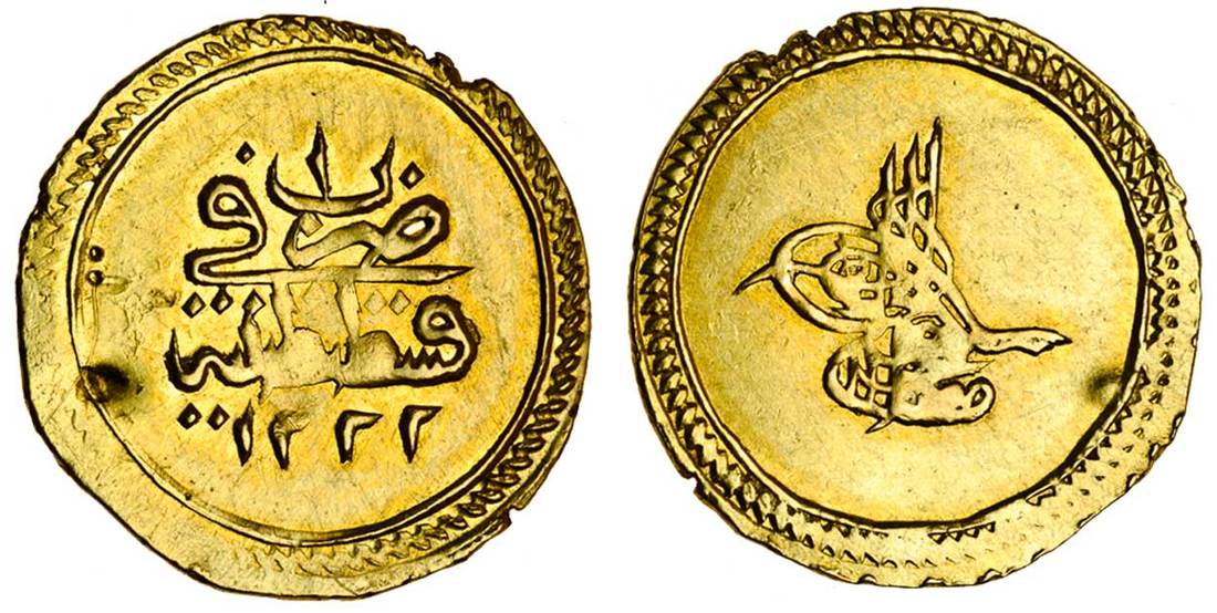 Ottoman Empire, Mustafa IV (1807-08), AV Altin, 3.20g, Qustantiniya, AH1222 / 1 (KM.546), damage in reverse field, very fine
