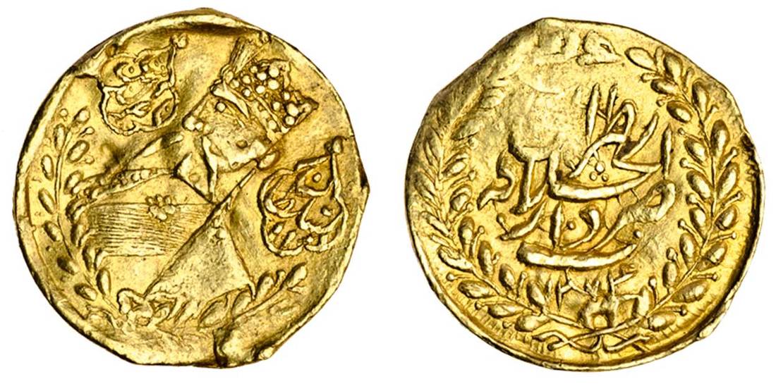 QajarDynasty, Nasir al-din Shah (1848-96), AV portrait Half-Toman, 1.67g, Dar al-Khilafat Tehran, AH1274, crowned bust of Shah left (KM.860), small area of damage, very fine with clear portrait, rare