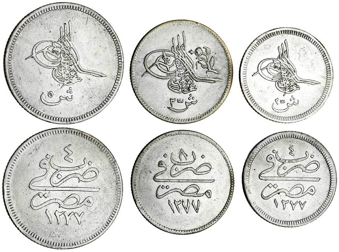 Ottoman Egypt, Abdul Aziz (1861-76), 5-Piastres, Misr, AH1277 / 4 , 2½-Piastres (2), Misr, AH1277 / 4 / 8, the first two with plain tughra, the last with flower to right of tughra (KM.251, 252, 253.1), the first two very fine, the last a little better, scarce (3)