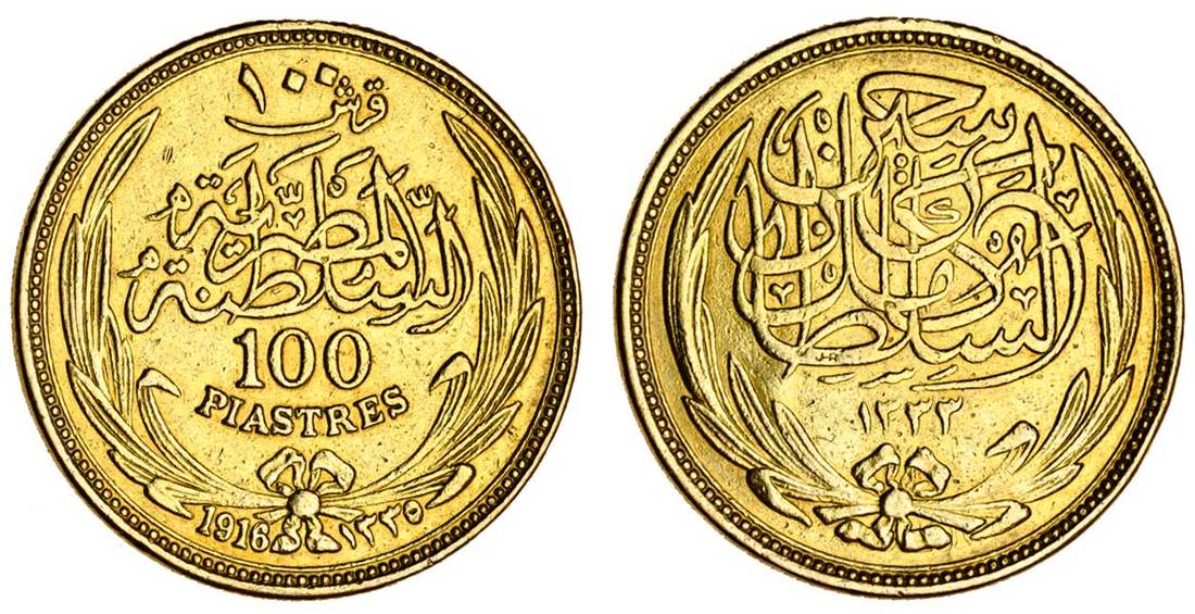 Egypt, British Protectorate, Hussein Kamil (as sultan 1914-1917), AV 100-Piastres, 1916 / AH1335, legend and denomination within wreath, rev. caligraphy naming Sultan Hussein Kamil with accession date beneath within a similar wreath (KM. 324; F 24), edge blemish at 12 o/clock, extremely fine