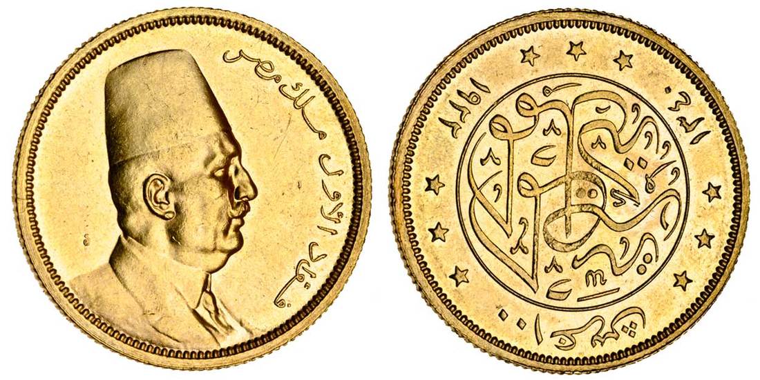 Egypt, Fuad I (1922-1936), AV 100-Piastres, 1922 / AH1340, bust of king Fuad right, rev. ornamental caligraphy within circular frame bearing denomination and dates (KM.341; Fr.27), good extremely fine