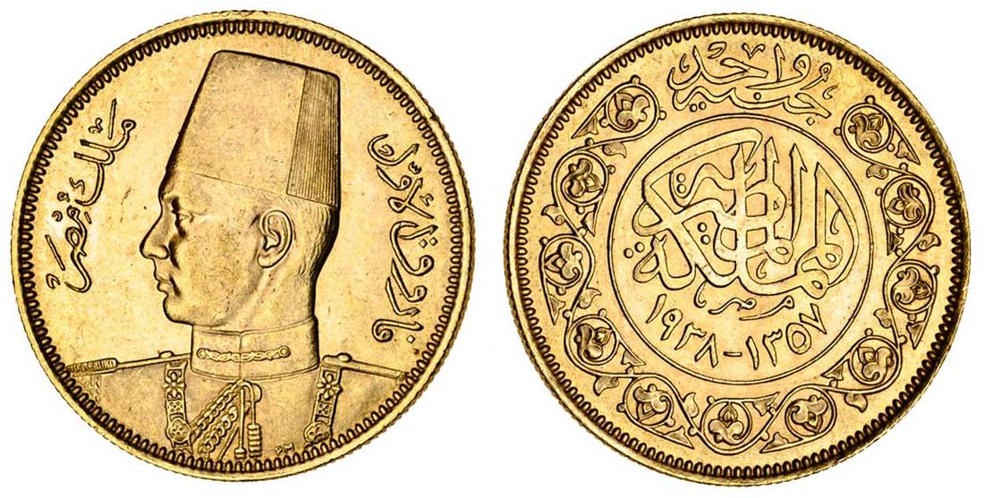 Egypt, Farouk I (1936-52), AV 100-Piastres, 1938 / AH1357, Royal Wedding, uniformed bust of king Farouk left, rev. legend in circular frame within wreath of vine leaves (KM.372; Fr.36), about uncirculated