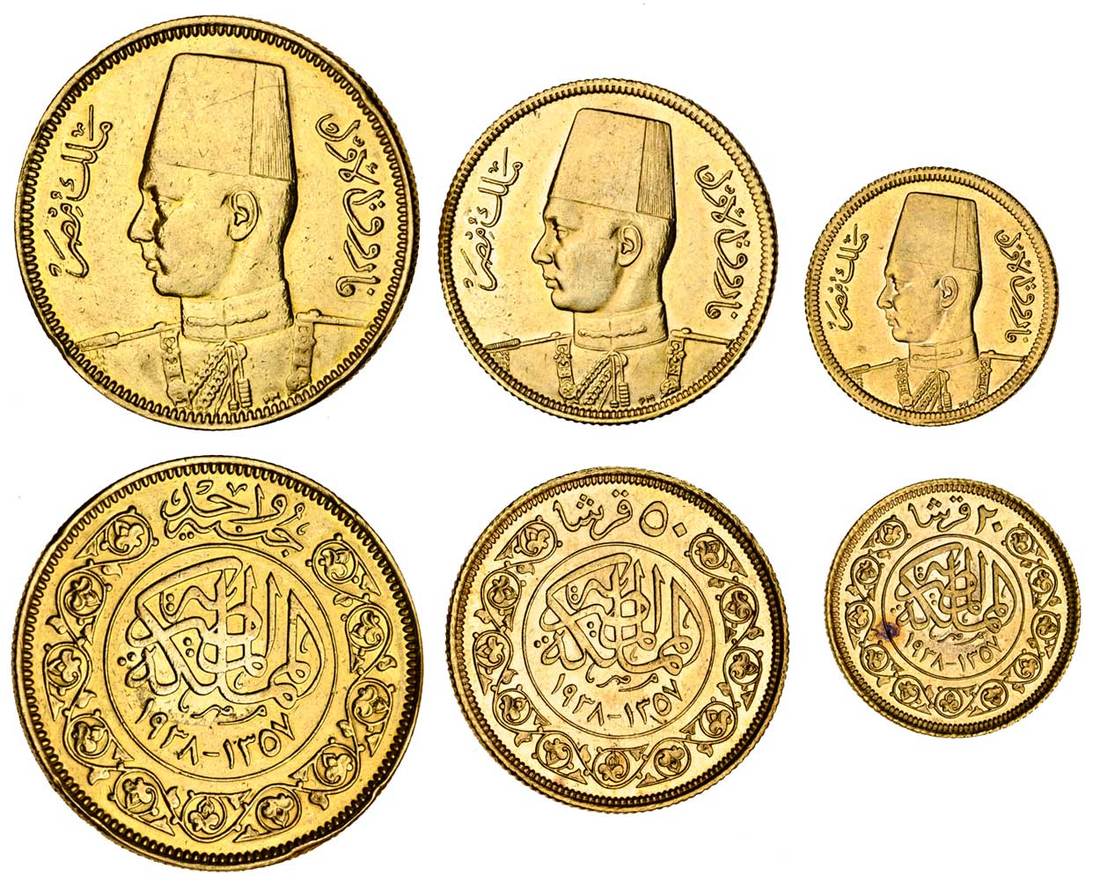 Egypt, Farouk I (1936-52), AV 100-, 50-, 20-Piastres, 1938 / AH1357, Royal Wedding, uniformed bust of king Farouk left, rev. legend in circular frame within wreath of vine leaves (KM.370, 371, 372; Fr.36, 37, 38), the 100-Piastres with some edge damage, generally extremely fine or better (3)