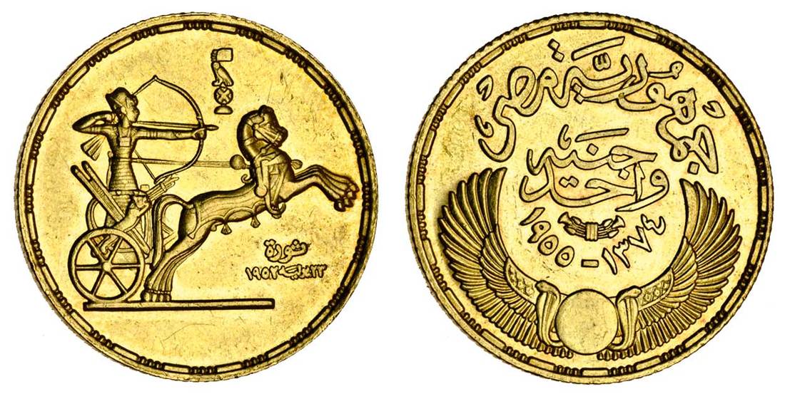 Egypt, First Republic (1953-58), AV Pound, 1955 /AH1374, third anniversary of the Revolution, charioteer shooting an arrow right, rev. winged symbol with legend above (KM.387; Fr.40), about uncirculated