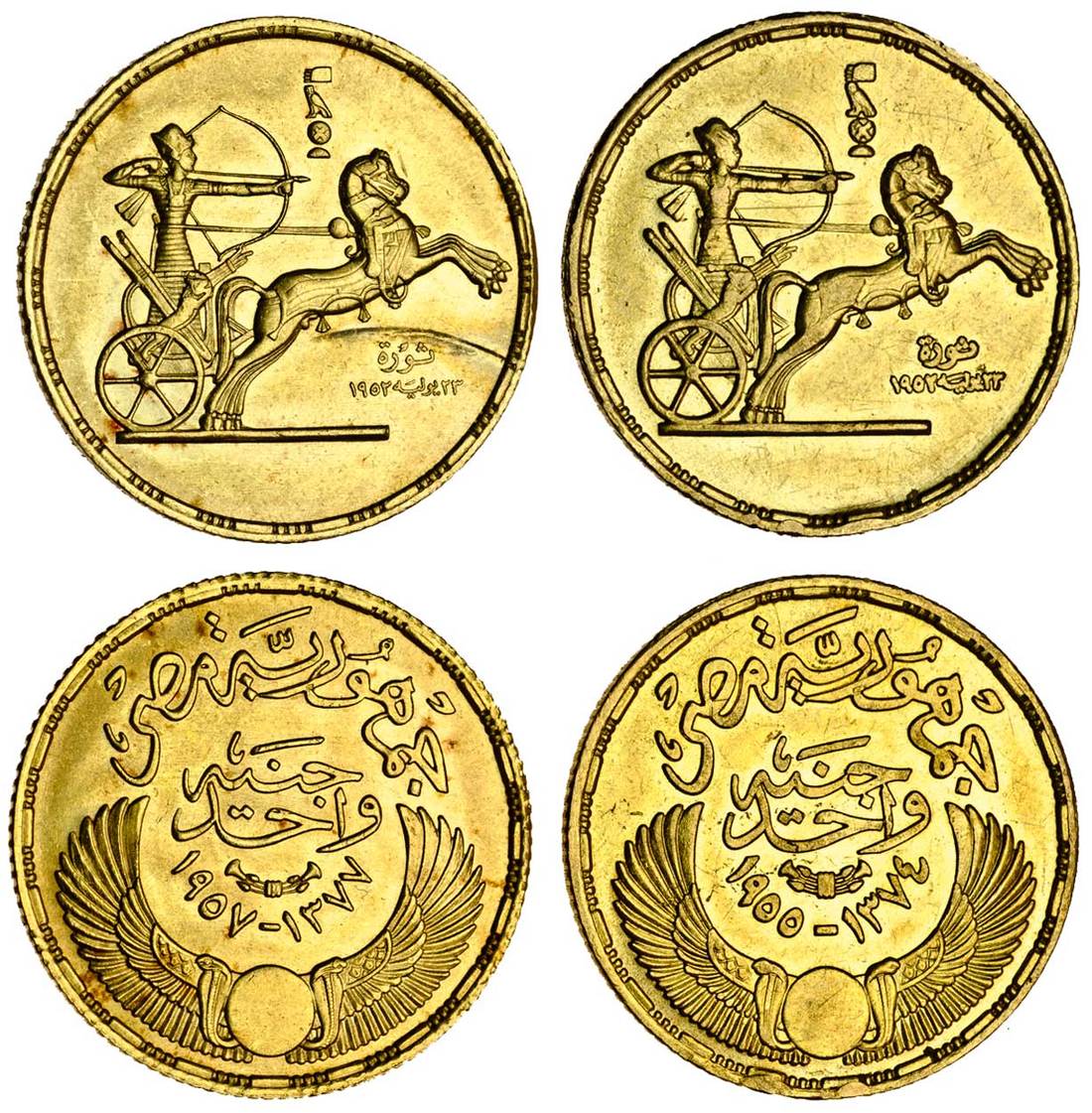 Egypt, First Republic (1953-58), AV Pounds (2), 1955 /AH1374, 1957 /AH1377, third and fifth anniversary of the Revolution, charioteer shooting an arrow right, rev. winged symbol with legend above (KM.387; Fr.40, 42), the first ex-mount, about uncirculated (2)
