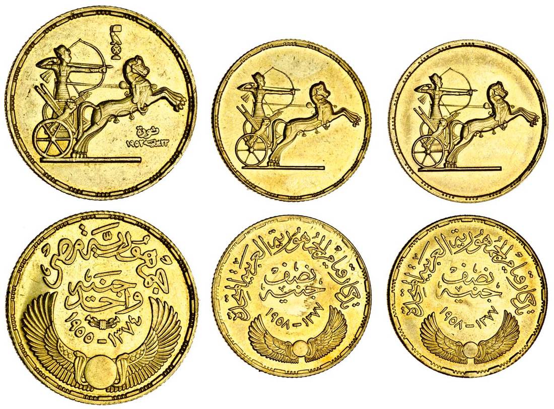 Egypt, First Republic (1953-58), Pound, 1955 /AH1374, United Arab Republic (1958-71), ½-Pounds (2), 1958 / AH1378, charioteer shooting an arrow right, rev. winged symbol with legend above (KM.387, 391; Fr.40), the Pound extremely fine, the ½-Pounds about uncirculated (3)