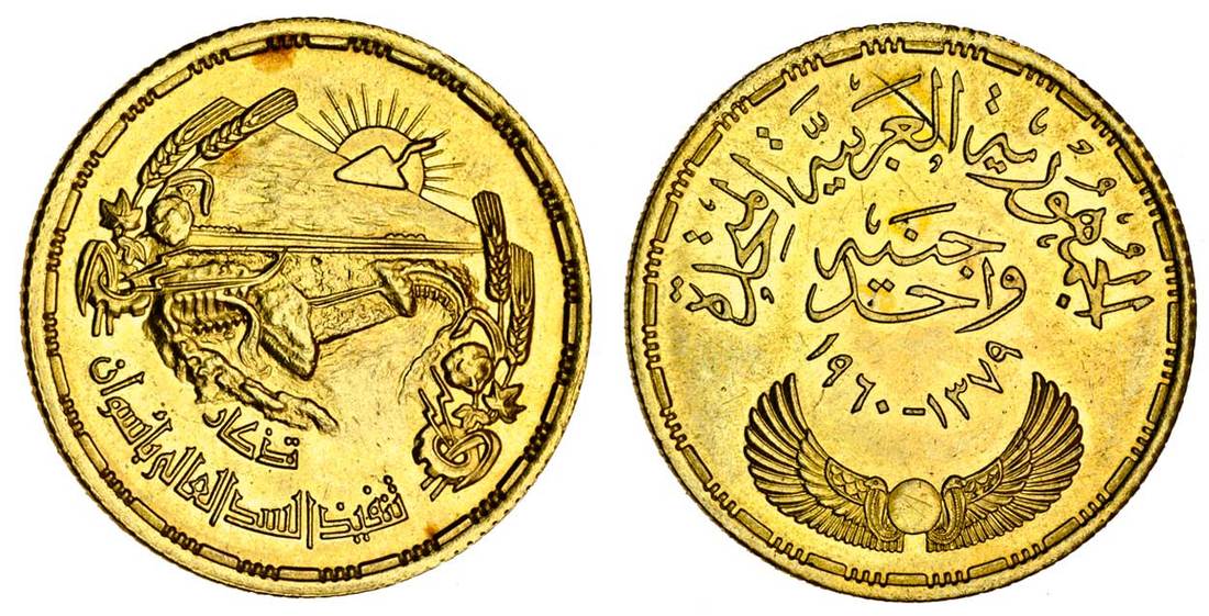 Egypt, United Arab Republic (1958-1971), AV Pound, 1960 /AH1379, commemorating the building of the Aswan Dam, Aswan Dam with trowel and sun above, rev. winged symbol with legend and dates above (KM.401; Fr.45), about uncirculated