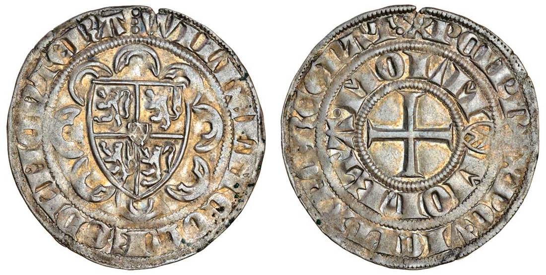 Germany, Berg, William II (1360-1408), Shield Gros, 2.42g, before 1380, Mulheim, :wilhelm comes de montera, shield, rev. +xpc. vicit. xpc. regnat. xpc. ipn, in outer circle, moneta. molm', in inner circle, shield at beginning of legend, cross (Noss 96), minor traces of verdigris, minor edge chip at 12 o'clock, otherwise very fine