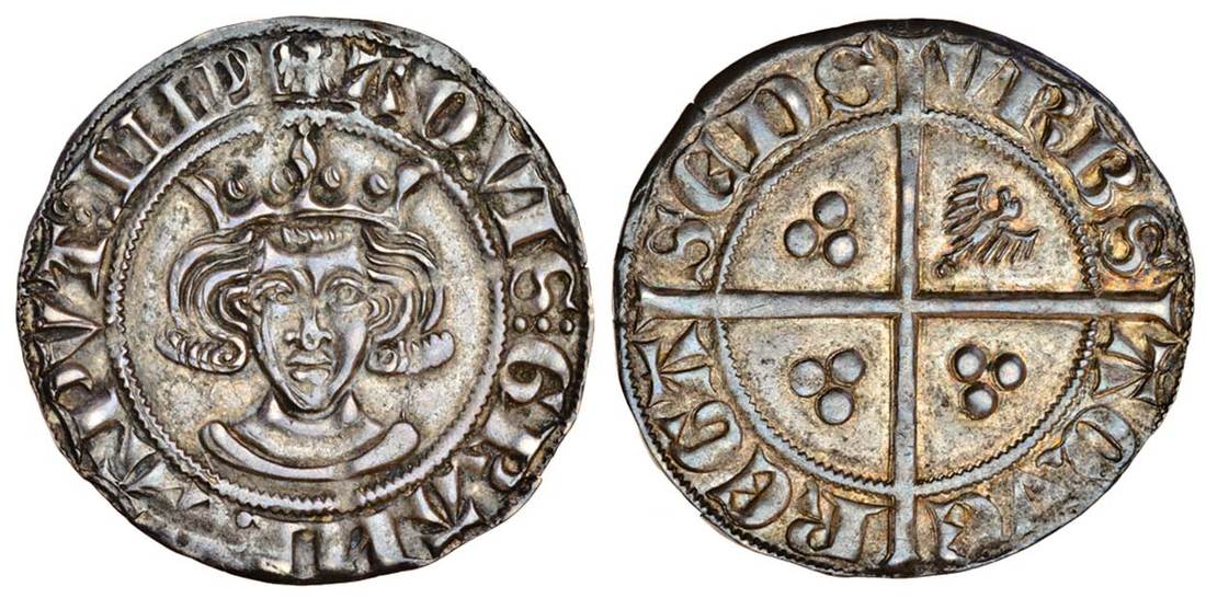 Germany, Aachen (Aix-la-Chapelle), Wilhelm I of Jülich (1356-61), Double-Sterling, 1.92g, +aqvis: crahi capvt. inpi, crowned head facing, rev. vrbs-aqve-rega-seds, long cross, eagle in second quarter, three pellets in remaining angles (Gamberini 1240; Chautard XXII, 8; Menadier 86h), good very fine, scarce