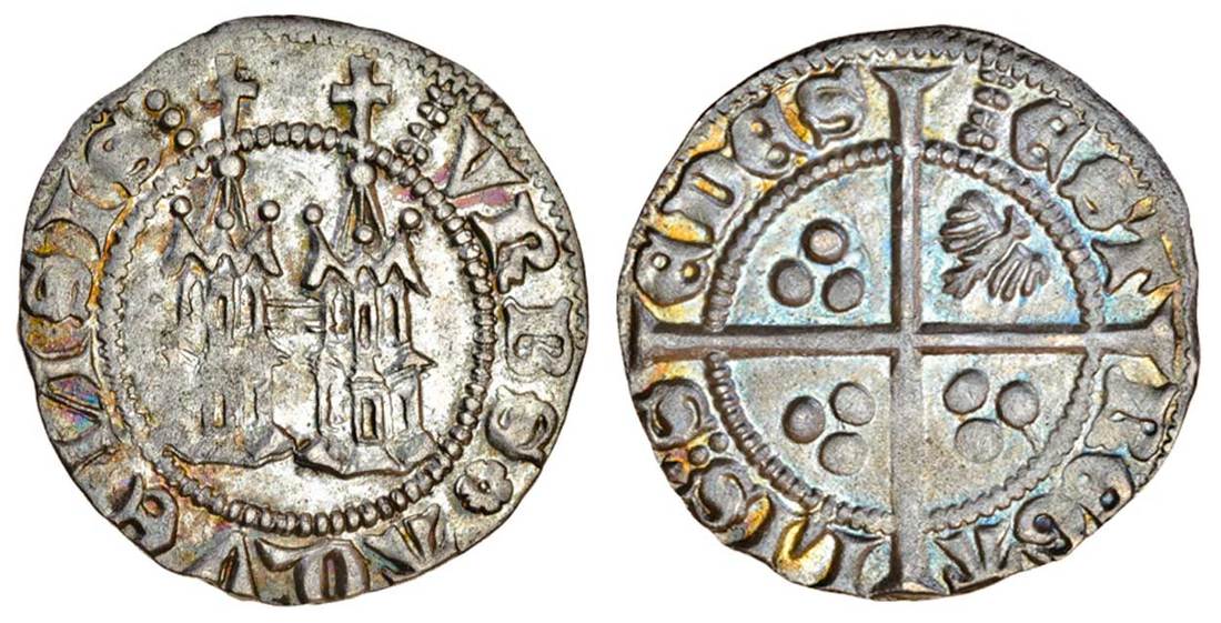 Germany, Aachen (Aix-la-Chapelle), Wilhelm II of Jülich (1361-93), Sterling, 1.35g, :vrbs* aqvensis:, church with two towers, rev. :est-rega-lis: s-edes, long cross, eagle in second quarter, three pellets in remaining angles (Menadier 90), good very fine