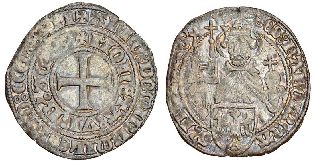 Germany, Aachen (Aix-la-Chapelle), Reinhold of Jülich (1402-23), Turnosgroschen, 1.96g, 1422, +anno: domini: milesimo: ccc: xxii, in outer circle, +moneta: vrb'. aqvs', in inner circle, cross, rev. scs: karol: ma-g: iperato', Charlemagne holding church model (Frey 20; Menadier 119; Saurma 2812), very fine, scarce