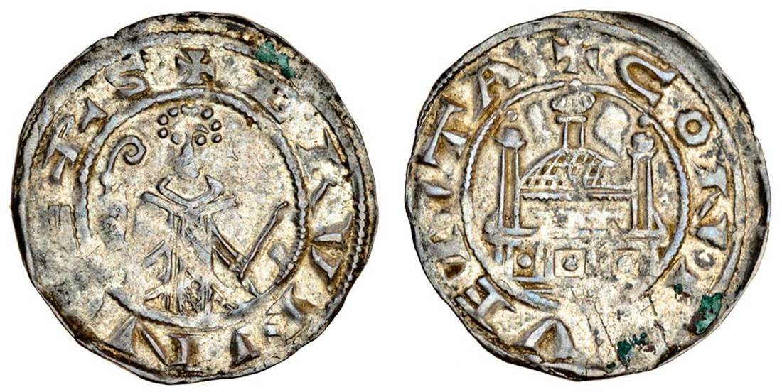 Germany, Trier, Bruno von Lauffen (1102-24), Denar, 0.86g, Koblenz, +Brvnno eps, Archbishop standing facing, rev. conflventa, church (Weiler 120), some verdigris, very fine