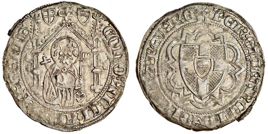 Germany, Trier, Kuno von Falkenstein (1362-88), 1½-Schilling or 18-Pfennige, 2.16g, Trier, cono archeps treverns, shields at beginning and end of legend, St Peter standing in arch, rev. per: cal: arcan: moneta: trevere, shield (Noss 166), very fine