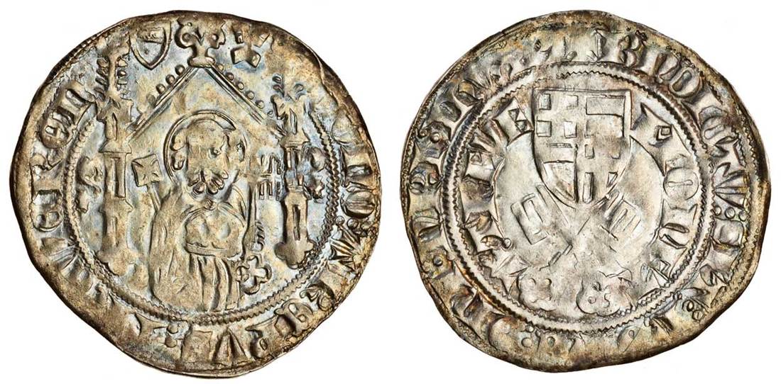 Germany, Trier, Kuno von Falkenstein (1362-88), Double Schilling, 2.18g, Trier, cvno arepvs treveren, St Peter standing under arch, rev. monet-a. treve around shield and crossed keys (Noss 174), very fine