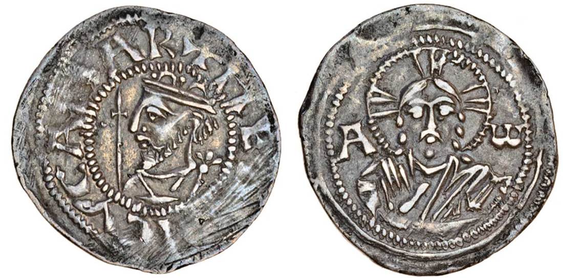 Germany, Prüm, Abbey, in the name of Henry III (1039-56), Denar, 1.22g, he[nri]cv ca[..]ar, crowned bust left, rev. bust of Christ, dividing a-w (Dbg.1189 var.), parts of the legend flat, very fine, rare