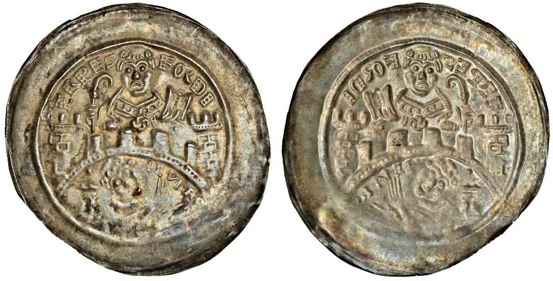 Germany, Erfurt, Heinrich I von Harburg (1142-58), Bracteat, 0.918g, erpes - fordi, St Martin holding cruzier and book above wall with to towers, pellet below book, the Archbishop and henrc below (Slg. Bonhoff 1087; MdeH 878; von Gotha 85i), a full coin, soft strike, the pellet beneath the book visible but not the ring, very fine
