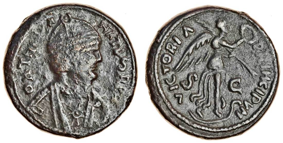 Ostrogoths, Theodahad (534-36), Carthage, AE Follis of 40-Nummi, 11.43g, dntheoda - hatvsrex, crowned bust right, rev. victoria principvm, Victory, holding wreath and palm, advancing right, s-c in field (MEC 143), fine, reverse better