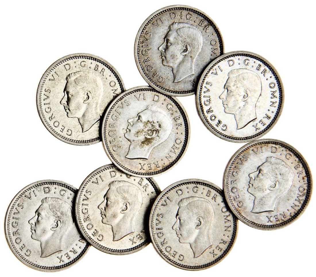 George VI (1936-52), Silver Threepences (8), 1937-44, rev. shield on rose dividing date (S.4085), good very fine to uncirculated, some with toning, the last three scarce (8)