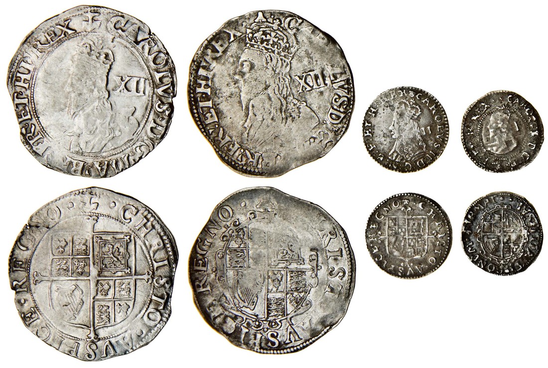Charles I (1625-49), Shillings (2), type 3a, Sharp E1/1, 5.95g, mm. bell, type 4.3, Sharp F3/1, 6.13g, mm. anchor (upright both sides), Penny, 0.54g, mm. two pellets, inner circle on obv only, Charles II (1660-85), hammered issue, Twopence, 0.84g, mm. crown (S.2791, 2796, 2846, 3317), about fine to good fine (4)