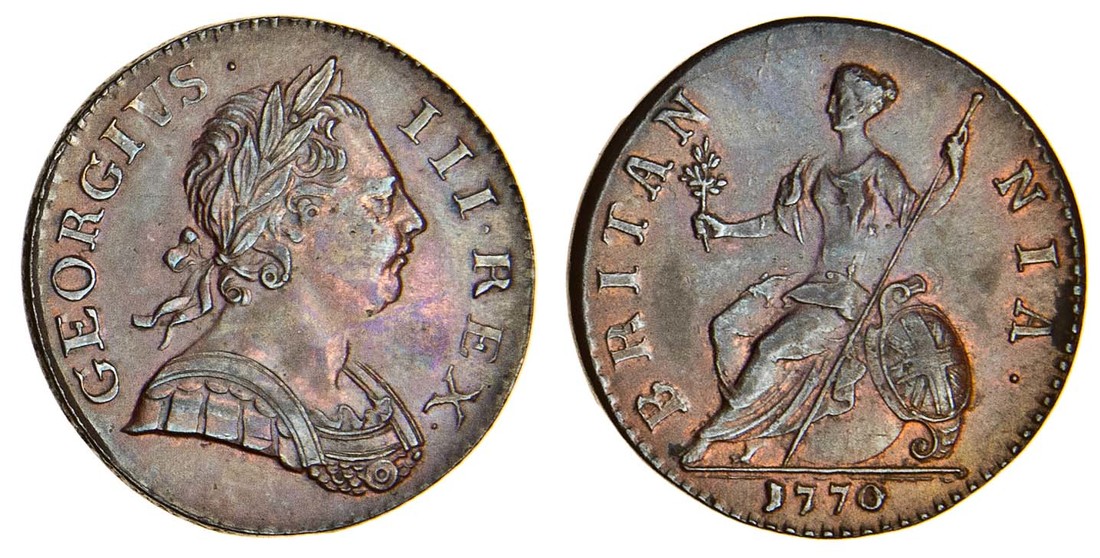 William & Mary to George III, Halfpennies (8), 1694 (2), 1697, 1699, 1717, 1720,1744, 1770 (S.3452, 3554, 3556, 3659, 3660, 3719, 3774), fair to almost extremely fine, the first four struck on cast blanks, all with pitting, one with traces of gilding, the seventh with extensive deposits, the last cleaned (8)