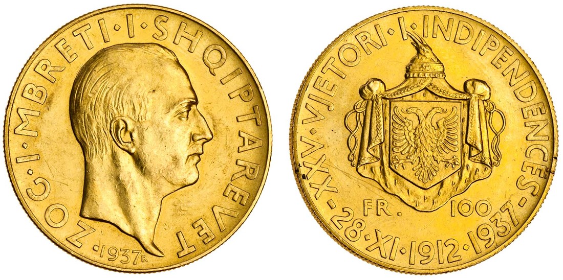Albania, Zog I (1925-39), AV 100-Franga Ari, 1937, head right, rev. crowned and draped arms, struck to commemorate the 25th Anniversary of Independence (F.11; KM 21), very fine, scarce