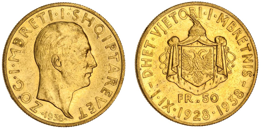 Albania, Zog I (1925-39), AV 50-Franga Ari, 1938-R, Rome, head right, rev. arms (F16; KM 25), about extremely fine